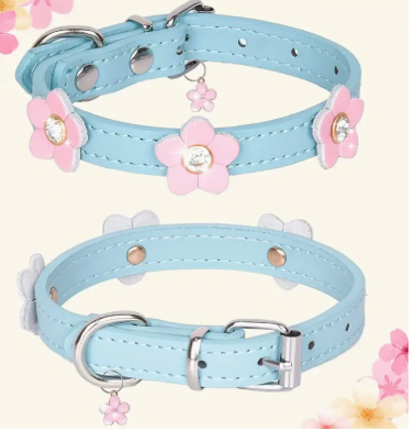 COLLAR DE VINIPIEL CON FLORES AZUL PARA PERRO
