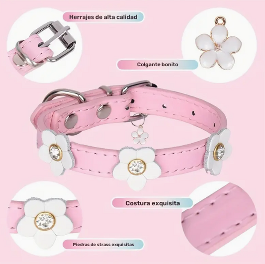 COLLAR DE VINIPIEL CON FLORES ROSA PARA PERRO