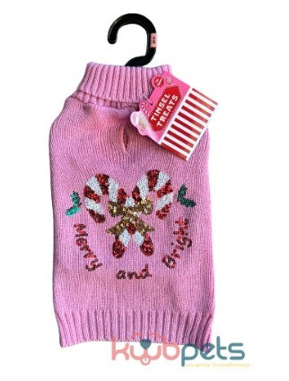 🎀✨ ¡Haz que tu mascota deslumbre esta temporada! 🐾💖 Con nuestro suéter tejido con bastón y lentejuelas rosas, tu peludo será el centro de atención en cada paseo y reunión. 🌟 Su diseño brillante y festivo combina estilo, comodidad y un toque de glamour perfecto para las fiestas.